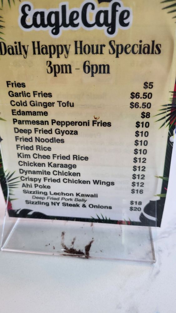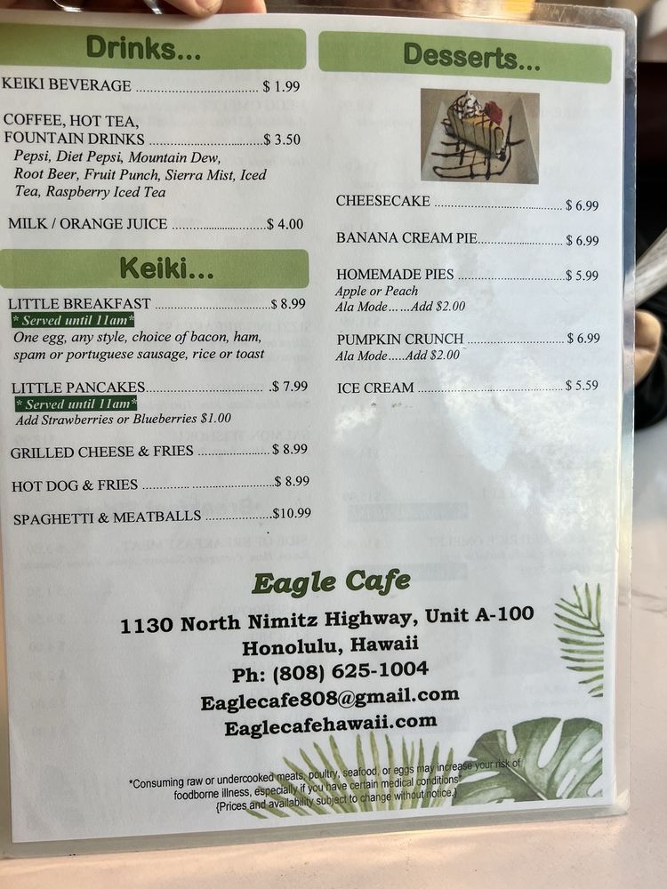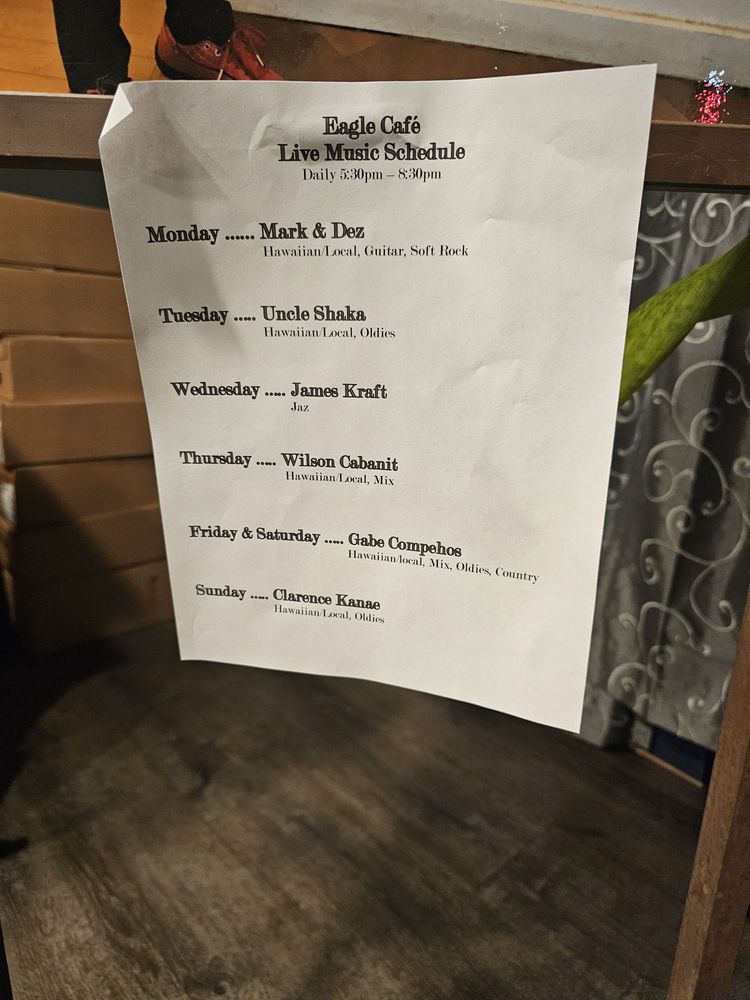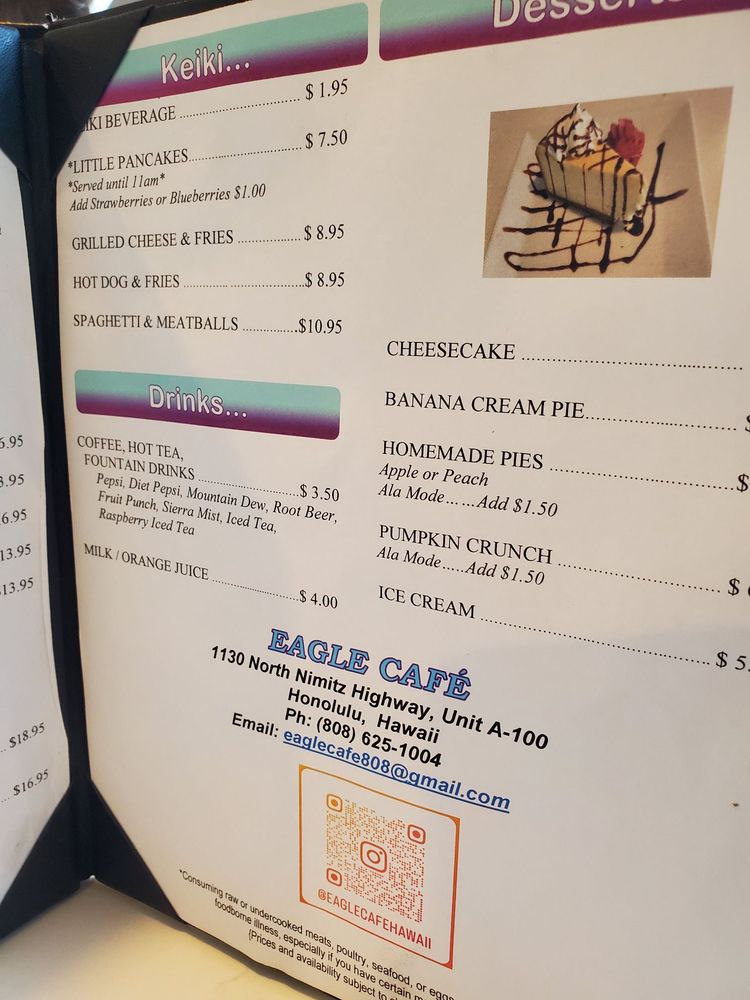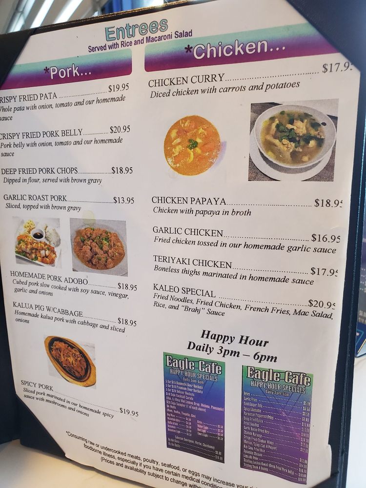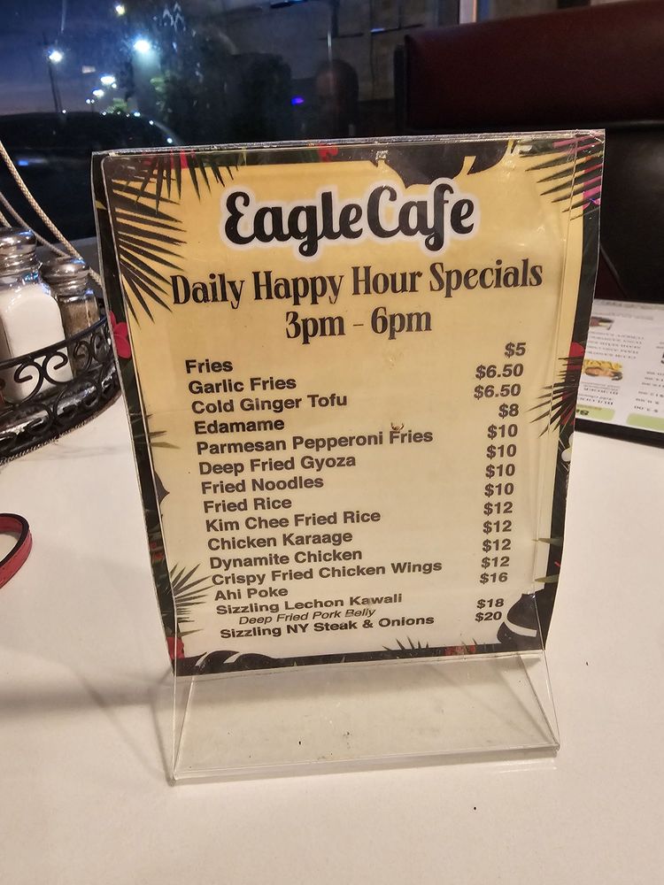 Nestled in Honolulu, the Asian-owned and women-owned Eagle Cafe offers a wide range of options for breakfast, brunch, lunch, and dinner. With a casual setting and moderate noise level, this cafe is perfect for groups, kids, and even private dining. They provide vegan options, limited vegetarian options, and accept various forms of payment, including cryptocurrency. The menu includes breakfast items like side of breakfast meat and pupu specialties like fried noodles and dynamite chicken. Their salads and soups, such as fire rock shrimp salad and miso soup, are simply delectable. With ample parking, free Wi-Fi, and attentive service, Eagle Cafe creates a cozy and welcoming atmosphere for its patrons. The positive reviews from satisfied customers highlight the excellent service, delicious food, and enjoyable live entertainment. Next time you visit Eagle Cafe, be sure to try their signature dishes like Bi Bim Bap and creamy mahi for a memorable dining experience.