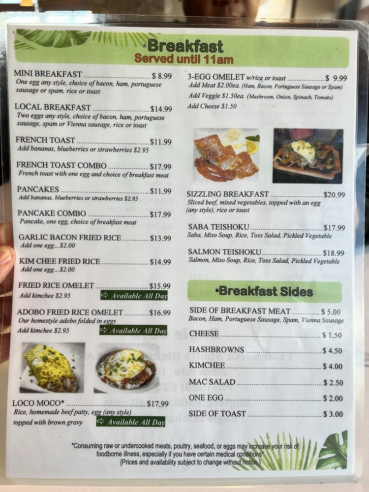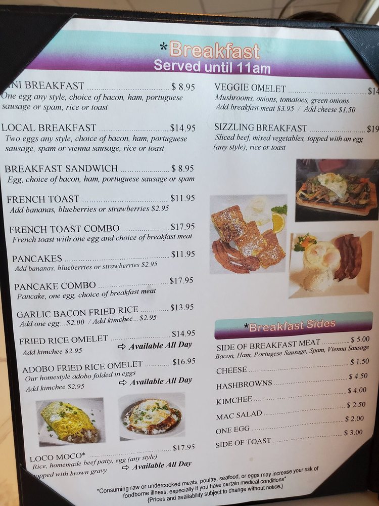 1 egg any style, your choice of ham, bacon, Portuguese sausage, or spam, and your choice of rice or toast.